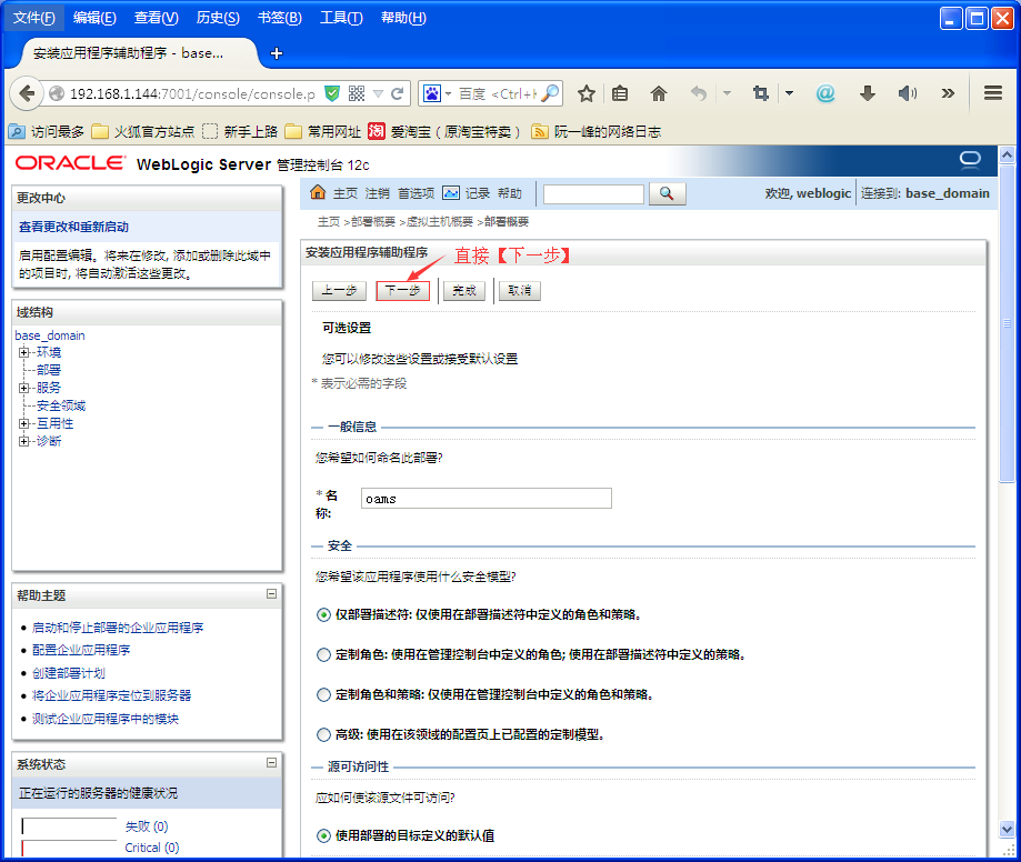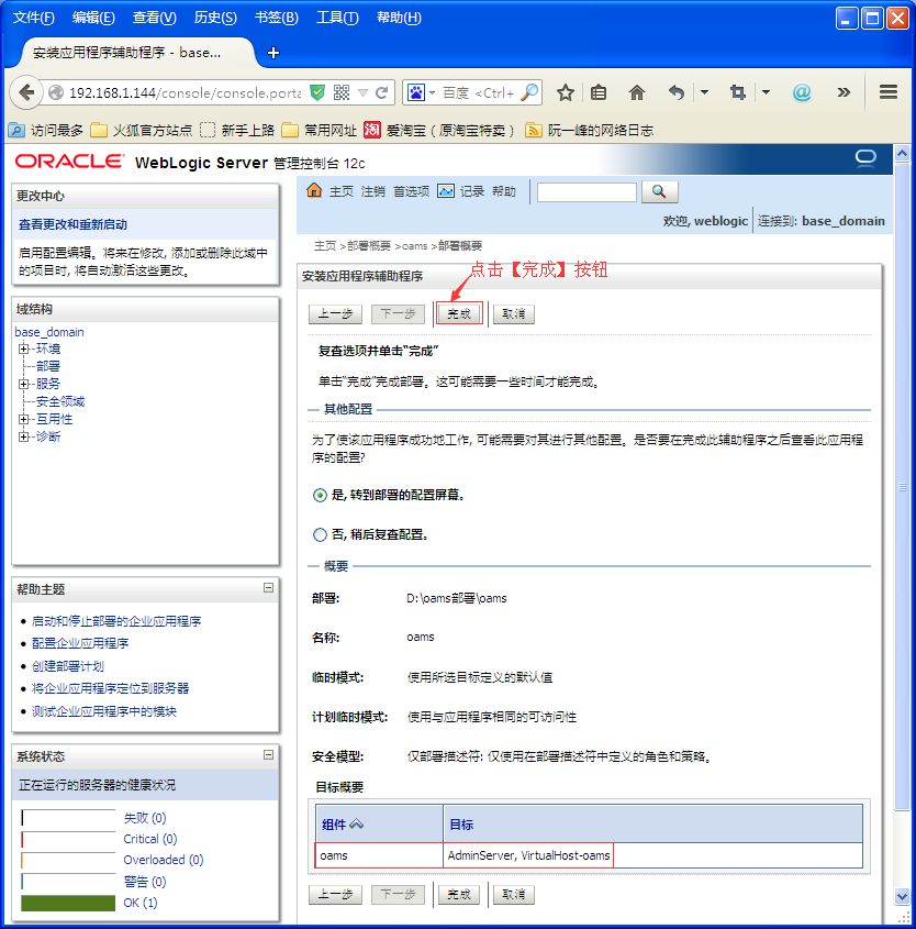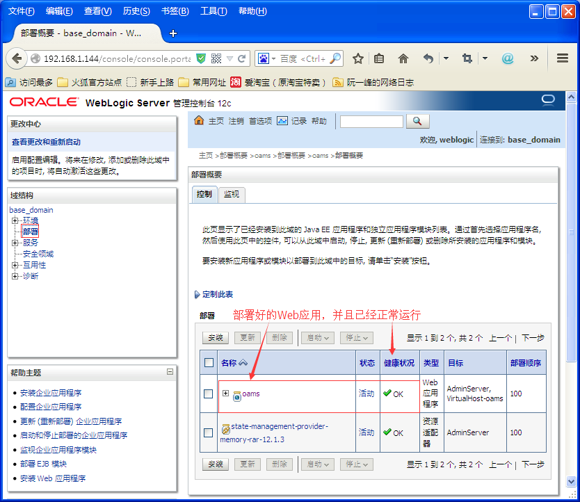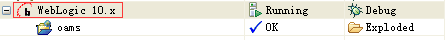 到此,在WebLogic下部署Web应用就算是完成了,切换回【部署】面板,就可以看到我们部署好的oams这个Web应用了。