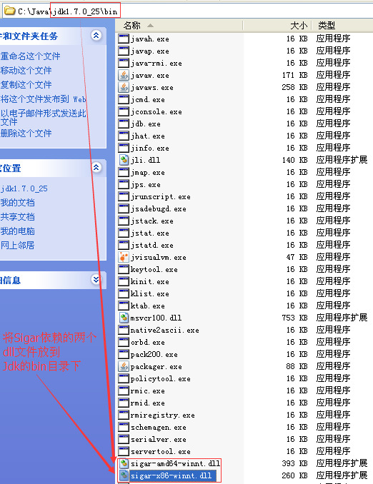 上网查了一下原因,原来sigar中有很多的实现是通过jni实现的,所以运行在不同的平台上需要加载对应的本地动态链接库,我猜想WebLogic在运行Web应用时,应该是没有找到Sigar.jar依赖的"sigar-amd64-winnt.dll"和"sigar-x86-winnt.dll"这两个dll,为了能够让WebLogic可以找到"sigar-amd64-winnt.dll"和"sigar-x86-winnt.dll",将这两个dll放在jdk/bin下即可,是因为jvm默认会在此路径下加载本地动态链接库,如下图所示: