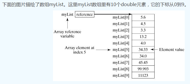 数组的元素是通过索引访问的。数组索引从0开始,所以索引值从0到arrayRefVar.length-1。