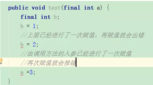 final局部变量由程序员进行显式初始化,如果final局部变量已经进行了初始化则后面就不能再次进行更改,如果final变量未进行初始化,可以进行赋值,当且仅有一次赋值,一旦赋值之后再次赋值就会出错。下面用具体的代码演示final局部变量的情况: