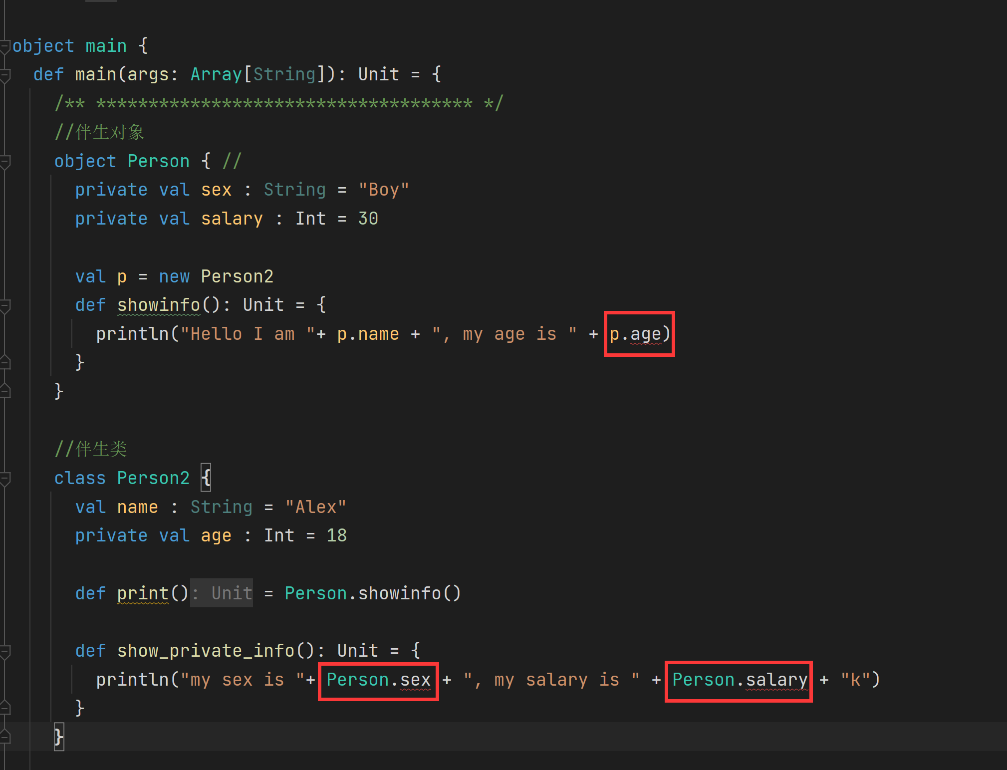 可以看到,伴生对象的私有成员Person.sex和Person.salary,在伴生类中都可以访问到,但是在伴生类的对象和子类中是不能访问上述两个私有成员的;伴生类的私有成员,在伴生对象中也可以访问到,如p.age。