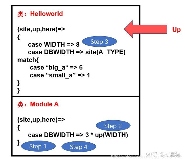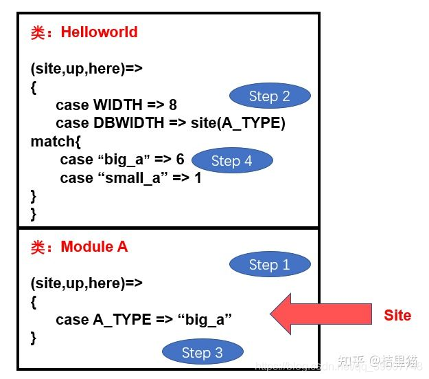 这套机制此处称之为site/here/up链表机制,其原理是逐级例化时将参数例化为链表,逐级查找。由于scala代码个人觉得是一种写起来比较省事但是易读性差到令人发指的语言,所以直接讲原理可能有困难。