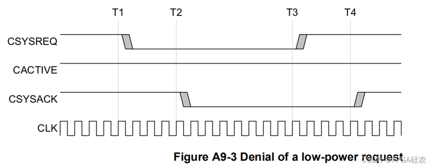 在 T1 时刻,系统时钟控制器驱动 CSYSREQ 为 LOW,以请求外围设备进入低功耗状态。在 T2 时,外围设备保持 CACTIVATE 为高,并拉低 CSYSACK 进行响应,表示拒绝该请求。在 T3 时刻,系统时钟控制器通过驱动 CSYSREQ 为高退出低功耗状态。在 T4 时刻,外围通过驱动 CSYSACK 为高进行响应,以退出低功耗状态。
