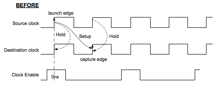 我们看下图,如果目的时钟和源时钟差一个固定的相位,则工具建立时间和保持时间的检查应该如下图所示: 很明显可以看到,这样的建立时间检查过于苛刻,但利好保持时间的检查。为了更具体的说明这个问题,我们假设时钟周期为4ns,接收端的时钟沿比发送端晚了0.3ns,若不进行约束,建立时间只有0.3ns,时序基本不可能收敛;而保持时间则为3.7ns,过于丰富。 因此,在这种情况下,我们应把捕获沿向后移一个周期,约束如下:
