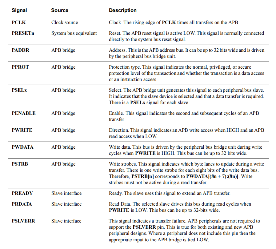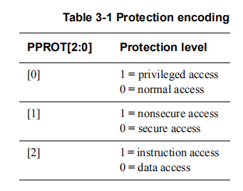 APB(Advanced Peripheral Bus)是AMBA总线体系的一部分。相较于AMBA总线体系中的其他总线,APB总线具有低功耗,低复杂度的特征。APB总线主要应用于对性能要求不太高的低带宽外设接口。 本文所讲述的是AMBA4中的APB协议。其信号如下: 其中,PCLK和PRESETn分别为时钟信号和复位信号,PADDR为地址(至多32位),PPROT为保护类型,PSELx为选中信号,当它为1时,表明选中该从设备,因此每个从设备都会有一个对应的PSELx信号,PENABLE为使能信号,下面会详细阐述,PWRITE表示本次传输的方向,1表示写,0表示读,PWDATA为要写的数据,至多32bit,PSTRB为字节选中信号,第i位为1,表示第i*8到第i*8+7位是有效的,PRDATA为读出的数据,同样至多32位,PSLVERR为传输失败指示信号,为1且PENABLE、PSELx、PREADY均为高时,表明传输错误,否则表示传输正确。 下图是PPROT信号各个位的含义