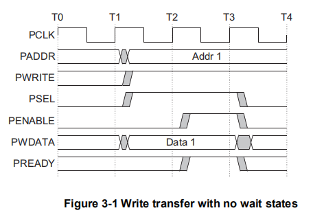 无等待的写传输,如下图所示,写传输分为两个阶段:Setup Phase和Access Phase,第一个周期,PADDR给出要写的地址、PWRITE为1表示写传输,同时PSELx拉高选中设备,PWDATA给出要写的数据,此时PENABLE为0,这个阶段叫做Setup Phase。第二个周期,上述信号保持不变,主机和从机分别拉高PENABLE和PREADY,写入数据完成,下一个周期,PSELx、PENABLE以及PREADY均拉低。(若紧接着下一次传输,则PSELx无需拉低)