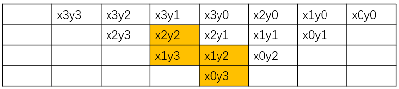 然后,在第一级,我们用半加器将x1y2和x0y3求和,得到结果a0和进位输出b0(写到下一级),同时也用半加器将x2y2和x1y3求和,得到结果a1和进位输出b1。 下一阶段,我们用半加器将x1y1和x0y2求和,得到结果c0和进位输出d0(写到下一级),同时,采用三个全加器分别对红色的三列求和,得到结果c1,c2,c3以及进位