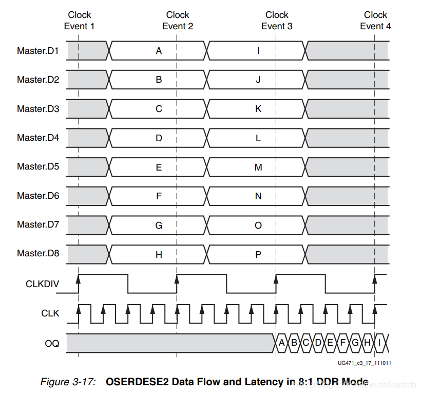 DATA_WIDTH为并串转换时并行数据的位宽。在不同的DATA_RATE_OQ和DATA_WIDTH下,串行数据输出的延迟也略有不同,如下表所示: