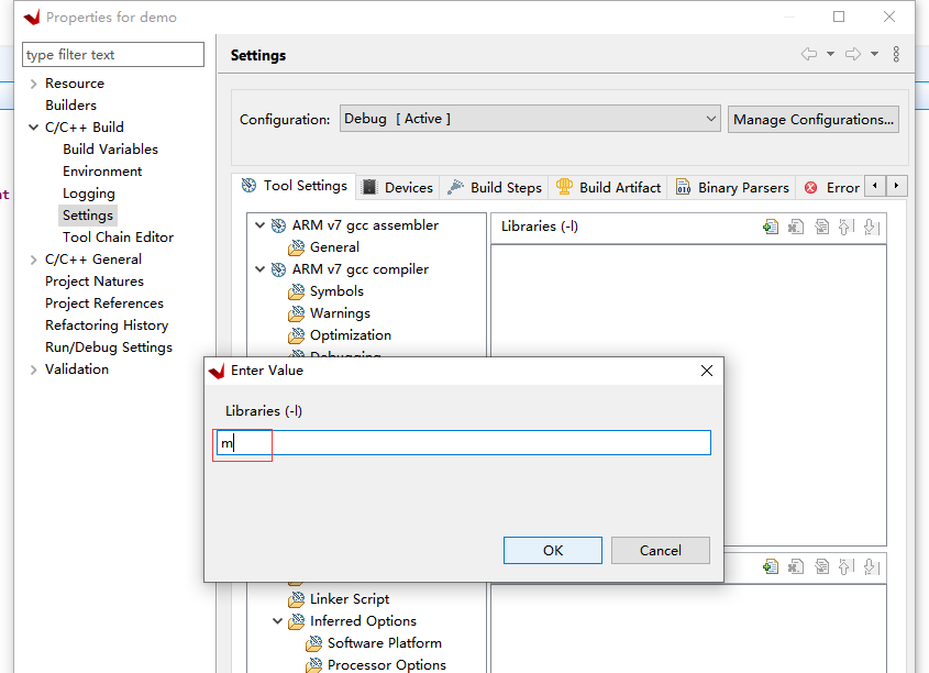 3.在弹出的窗口中输入m(表示math库),点击ok,并应用