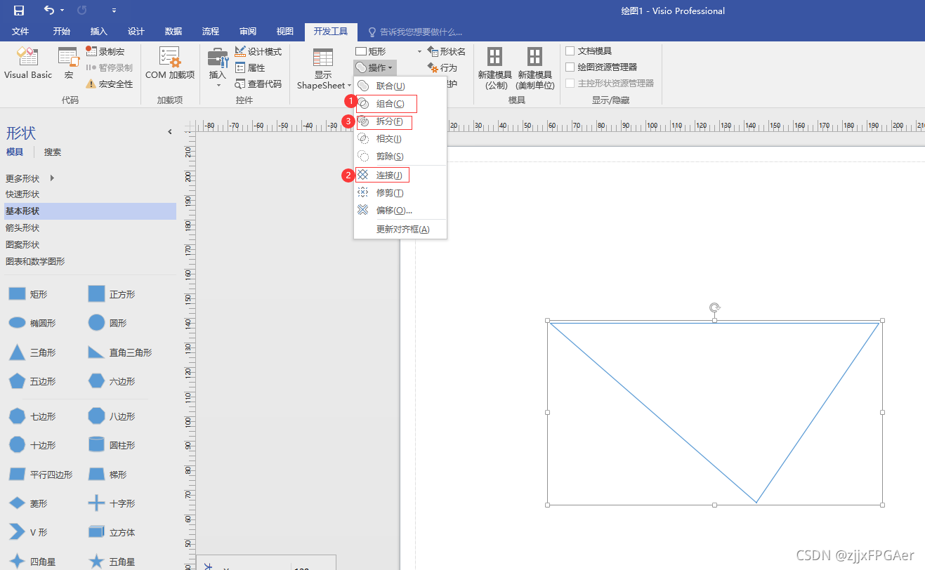选中图形,在开发工具中选择操作,依次进行组合,连接和拆分
