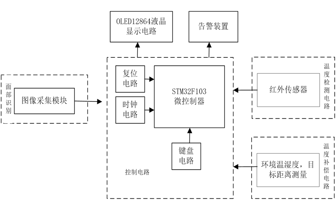利用红外传感器、面部识别模块可以获取人的体温,判断他是否符合防疫标准和身份是否正确,经过信号调理以后,便把数据发送给STM32单片机进行运算处理与判断,并将人的身份和人的体温送OLED显示。