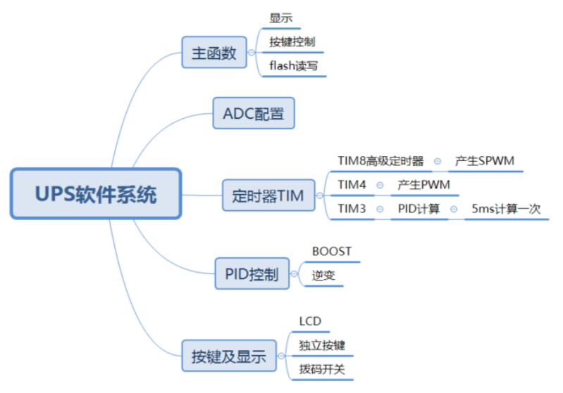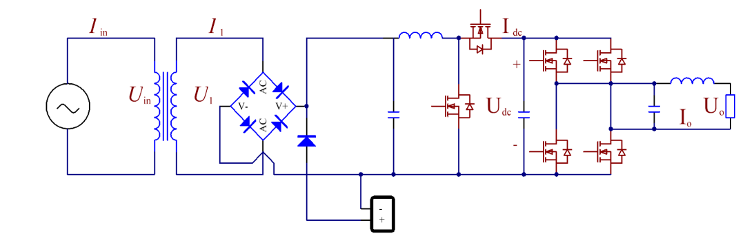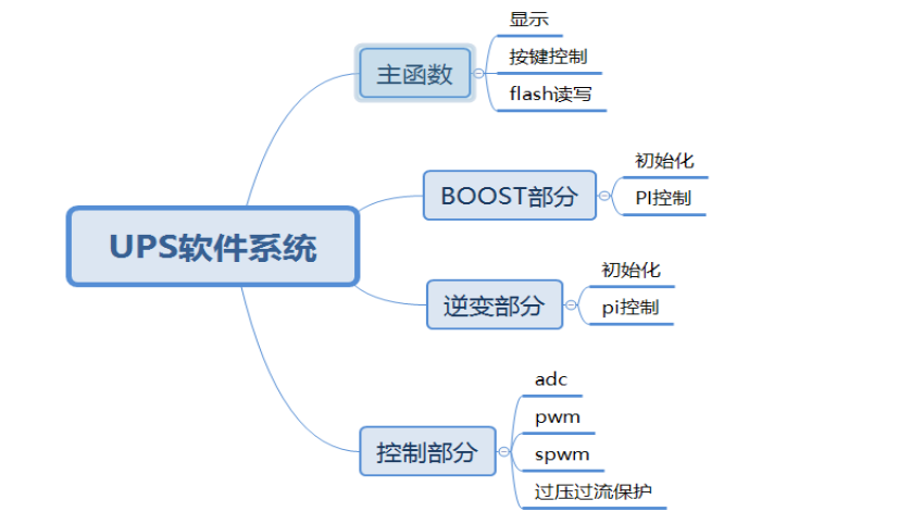 此电源系统的大体电路模块可分为控制电路、整流电路、Boost升压电路、单相逆变电路、交流直流采样电路、辅助电源电路。