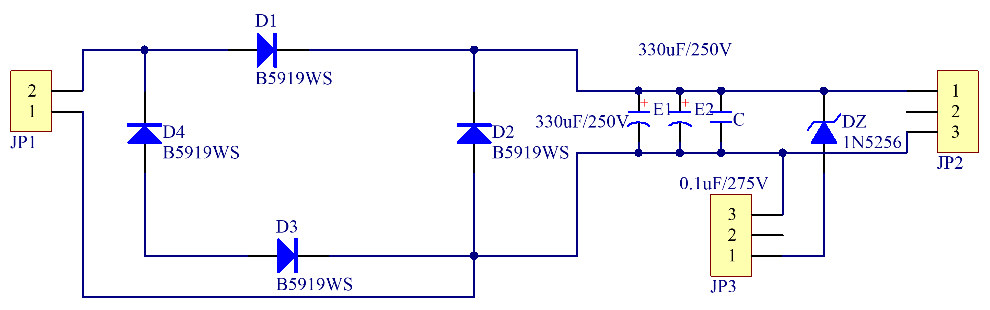 采用全桥整流电路。全桥整流电路是对半波整流的改进,利用二极管单向导电性进行整流。桥式整流电路克服了全波整流电路要求变压器次级有中心抽头和二极管承受反压大的缺点,实际应用广泛。