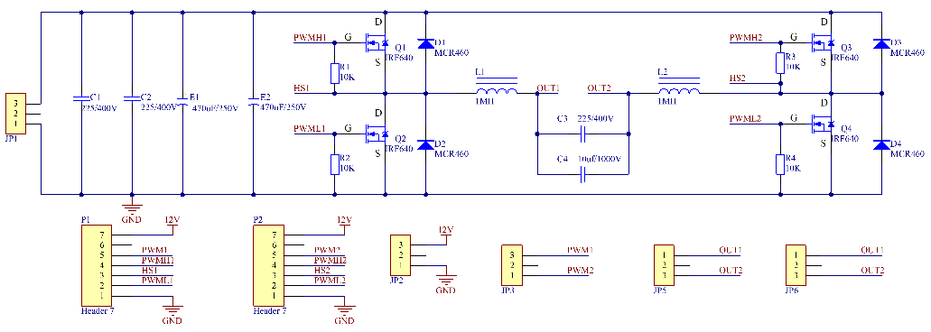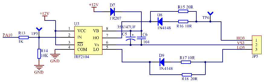MOS管驱动电路采用驱动芯片IR2104驱动外置MOS管实现,IR2104型半桥驱动芯片能够驱动高端和低端两个N沟道MOSFET,能提供较大的栅极驱动电流,并具有硬件死区、硬件防同臂导通等功用。