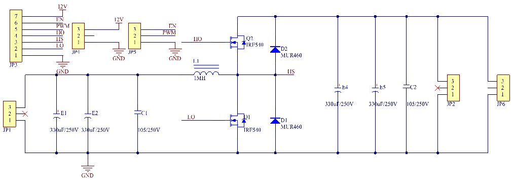 使用IR2104驱动电路来驱动MOS管控制其开关。当MOS管导通时,电感以的速度充电,把能量储存在L中。当开关截止时,L产生反向感应电压,通过MOS管Q2把储存的电能以的速度释放到输出电容器C2中。
