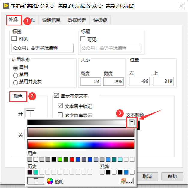 在外观→颜色中将提示按钮的开、关状态颜色均修改为透明,如下图所示: