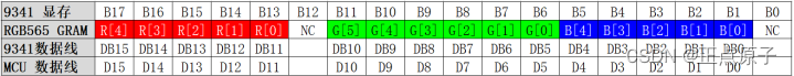表25.1.1.1 TFT-LCD接口信号线 上述的接口线实际是对应到液晶显示控制器上的,这个芯片位于液晶屏的下方,所以我们从外观图上看不到。控制LCD显示的过程,就是按其显示驱动芯片的时序,把色彩和位置信息正确地写入对应的寄存器。 25.1.2 液晶显示控制器 正点原子提供2.8/3.5/4.3/7寸等4种不同尺寸和分辨率的TFTLCD模块,其驱动芯片为:ILI9341/ST7789/NT35310/NT35510/SSD1963等(具体的型号,大家可以通过下载本章实验代码,通过串口或者LCD显示查看),这里我们仅以ILI9341控制器为例进行介绍,其他的控制基本都类似,我们就不详细阐述了。 ILI9341液晶控制器自带显存,可配置支持8/9/16/18位的总线中的一种,可以通过3/4线串行协议或8080并口驱动。正点原子的TFTLCD模块上的电路配置为8080并口方式,其显存总大小为172800(24032018/8),即18位模式(26万色)下的显存量。在16位模式下,ILI9341采用RGB565格式存储颜色数据,此时ILI9341的18位显存与MCU的16位数据线以及RGB565的对应关系如图25.1.2.1所示: