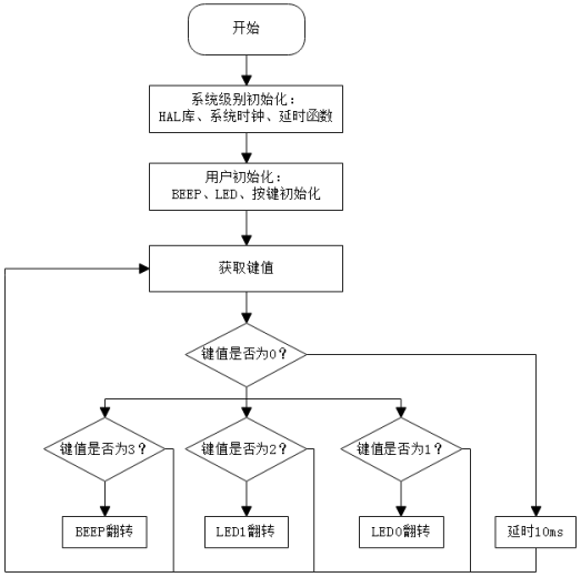 - 例程功能 通过开发板上的三个独立按键控制LED灯:WKUP控制LED0翻转,KEY1控制LED1翻转,KEY0控制蜂鸣器翻转。