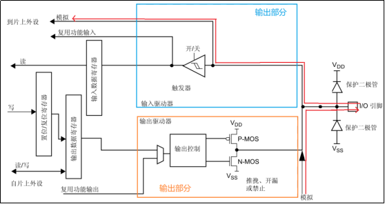 图10.1.4. 8推挽输出模式 7、开漏式复用功能 开漏式复用功能:一个IO口可以是通用的IO口功能,还可以是其他外设的特殊功能引脚,这就是IO口的复用功能。一个IO口可以是多个外设的功能引脚,我们需要选择作为其中一个外设的功能引脚。当选择复用功能时,引脚的状态是由对应的外设控制,而不是输出数据寄存器。除了复用功能外,其他的结构分析请参考开漏输出模式。 另外在开漏式复用功能模式下,施密特触发器也是打开的,我们可以读取IO口的电平状态,同时外设可以读取IO口的信息。