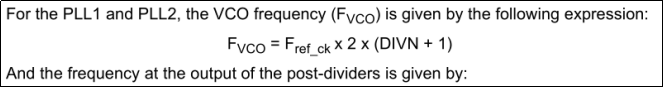 表9.1.2. 3 MCO时钟输出引脚 MCO1SEL和MCO2SEL是时钟源选择器,分别选择MCO1和MCO2的时钟来源; MCO1DIV和MCO2DIV是时钟分频器(也叫预分频器),取值范围是1~16; MCO1时钟源来自hse_ck、lse_ck、his_ck、lsi_ck和csi_ck,用于输出HSI,HSE,CSI,LSI或LSE时钟。 MCO2时钟源来自mpuss_ck、axiss_ck、mcuss_ck、pll4_p_ck、hse_ck和hsi_ck,用于输出MPUSS、AXISS、MCUSS、PLL4(PLL4_P)、HSE或HSI时钟。 3. 锁相环PLL ③处是和锁相环有关部分。 PLL(Phase Locked Loop) 锁相环路,其作用是使外部的输入信号与内部的振荡信号的相位同步,在STM32中主要用于分频和倍频。STM32MP1有4个锁相环,分别为PLL1、PLL2、PLL3和PLL4: PLL1,用于向MPU子系统提供时钟; PLL2,用于向AXI子系统、DDR和GPU提供时钟; PLL3,用于向MCU子系统提供时钟并为外设生成内核时钟; PLL4,用于生成外设的内核时钟。 ④是PLL时钟源选择器。 锁相环输入时钟源有三个:his_ck、hse_ck 和csi_ck,分别对应HSI、HSE和CSI的时钟。我们可以配置某个锁相环选择对应的时钟源。 ⑤是PLL时钟源分频器 DIVM1、DIVM2和DIVM3和DIVM4分别是PLL1、PLL2、PLL3和PLL4的分频器,取值范围都是1~64,表示将输入时钟源进行分频。 ⑥是锁相环 其中PLL1是一个输入一个输出,PLL2、PLL3和PLL4是一个输入三个输出。 我们以PLL3为例子分析一下锁相环的内部结构: VCO表示输出频率; DIVN表示VCO的倍数; DIVP、DIVQ和DIVR表示预分频器; SSCG扩频时钟发生器,可以减少EMI峰值的数量,一般不用设置; FRACV是分数倍频系数,它和DIVN一起组成PLL的倍频系数,当FRACV等于0的时候表示在整数模式下,大于0的时候表示在小数(或者说分数)模式下。 PLL输出的频率有两种计算方法,我们以PLL3输出pll3_p_ck为例,其它锁相环的输出计算方法类似,时钟源默认使用HSI,即64MHz。 在整数模式下使用PLL:
