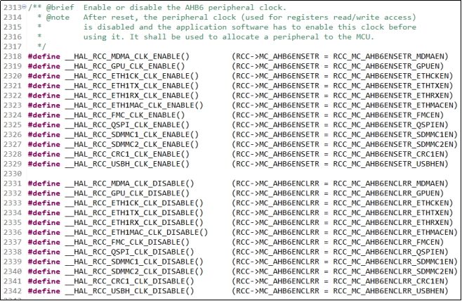 图9.2.2.3 外设时钟使能/禁用宏定义 例如,WWDG部分: 1 #define __HAL_RCC_WWDG1_CLK_ENABLE() (RCC->MC_APB1ENSETR = \ RCC_MC_APB1ENSETR_WWDG1EN) 2 #define __HAL_RCC_WWDG1_CLK_DISABLE() (RCC->MC_APB1ENCLRR = \ RCC_MC_APB1ENCLRR_WWDG1EN) RCC_MC_APB1ENSETR_WWDG1EN和RCC_MC_APB1ENCLRR_WWDG1EN在stm32mp157axx_cm4.h头文件中有定义: #define RCC_MC_APB1ENSETR_WWDG1EN B(28) #define RCC_MC_APB1ENCLRR_WWDG1EN B(28) B(28)则表示将第28位置1,所以(RCC->MC_APB1ENSETR = RCC_MC_APB1ENSETR_WWDG1EN)就表示将RCC_MC_APB1ENSETR寄存器的第28位写1,也就是开启WWDG这个外设的时钟。在代码中,要开启WWDG的时钟的话,直接调用__HAL_RCC_WWDG1_CLK_ENABLE()这个宏就可以实现,其它的所有外设的时钟开启都可以类推。 同理,(RCC->MC_APB1ENCLRR = RCC_MC_APB1ENCLRR_WWDG1EN)表示关闭WWDG的时钟,不过因为WWDG特殊,系统运行的时候是不能将WWDG时钟关闭的,所以寄存器RCC_MC_APB1ENCLRR并没有针对WWDG的操作位,所以调用__HAL_RCC_WWDG1_CLK_DISABLE()这个宏是没什么实际意义的,不过对于其它一般的外设,例如I2C3、USART2、UART8等,调用对应的宏就可以将外设时钟关闭了。 又例如GPIOA~GPIOK是挂在AHB4总线上的,在HAL库的stm32mp1xx_hal_rcc.h头文件中同样有GPIO时钟开启和关闭宏定义,操作方法也和上面的外设类似。