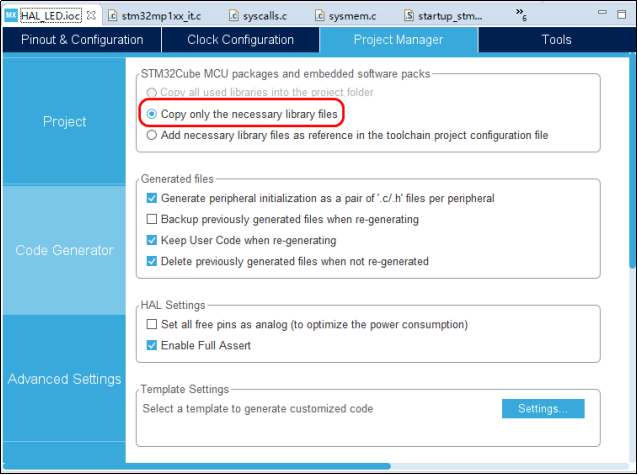 图8.3. 11 ST官方模板文件 stm32mp1xx_it.c文件包含异常处理程序和外设中断服务程序,文件中有调用HAL_IncTick函数来保证Systick每隔1ms产生一次中断(我们在7.4.2的第1小节有分析)。中断服务函数也可以编写在其他文件中,比如各个硬件的驱动文件里面,既然STM32CubeIDE生成了此文件,那我们就利用此文件好了,在以后的项目开发中,我们的中断服务函数都可以在此文件中添加。 syscalls.c文件 syscalls 翻译过来是系统调用的意思。syscalls.c是MCU最小系统调用文件,由STM32CubeIDE 自动生成。打开文件,文件调用了一些C函数库,例如标准输入输出函数stdio.h,还有返回错误事件错误码的errno.h函数等,这些函数的具体实现,可以参考Newlib 或者libc说明手册。 注: Newlib和libc是一个开源的、面向嵌入式系统的C运行库,可以将这些库移植到我们工程代码中,详细信息可以参考官网链接: http://www.gnu.org/software/libc/ https://sourceware.org/newlib/ syscalls.c文件中还有getpid(取得进程识别码)函数,例如_write函数和_read函数,如果我们做串口实验会遇到printf的重定向问题,printf的调用流程是先调用_write函数,再调用__io_putchar或__io_getchar函数,那么我们可以直接调用syscalls.c文件,然后根据需要可以修改里边的内容。 sysmem.c文件 sysmem.c文件,翻译过来就是和系统内存有关的文件,此文件是STM32CubeIDE系统内存调用文件,文件中调用了_sbrk函数,将内存分配给newlib堆,并由malloc使用。其实也是C库函数,可以参考Newlib 或者libc说明手册进一步了解,此函数不是重点介绍内容。 4. Startup文件夹 Startup下是启动文件startup_stm32mp157daax.s,此启动文件和我们之前6.3.5小节讲解的CMSIS文件夹中的startup_stm32mp15xx.s文件是一样的,它是是系统上电后第一个运行的程序,主要用于: ①设置栈指针SP; ②设置初始PC= Reset_Handler; ③设置中断向量表入口地址,并初始化向量表; ④初始化.data 和 .bss 段; ⑤跳转到C库中的main 关于此文件的详细内容,可以再返回到6.3.5小节进行了解。 5. Drivers文件夹 Drivers文件夹下就是HAL库了,里边的文件是STM32CubeIDE从之前下载的STM32CubeMP1固件包中拷贝的。记得我们之前在创建工程的时候采用默认配置,或者在4.1.2的第4小节操作中,在STM32CubeMX插件中配置了Copy only the necessary library files选项,意思就是,生成工程时,会从STM32CubeMP1固件包中拷贝需要用到的HAL库文件,没用到的不会拷贝,这样生成的工程就比较精简和小巧。