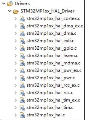 表8.3. 1 CM4工程列表 在生成工程的时候,STM32CubeIDE会从STM32CubeMP1固件包中拷贝必要的文件。其中在工程的根目录下,Common文件夹拷贝的是固件包中的system_stm32mp1xx.c文件,Drivers文件夹下拷贝的是固件包中的HAL库文件(包括头文件和源文件)。而CM4工程的Common文件夹和Drivers文件夹里的文件其实也是拷贝了STM32CubeMP1固件包中的源文件(没有拷贝头文件),其中,CM4工程的源文件会引用工程根目录下Drivers文件夹里的头文件。