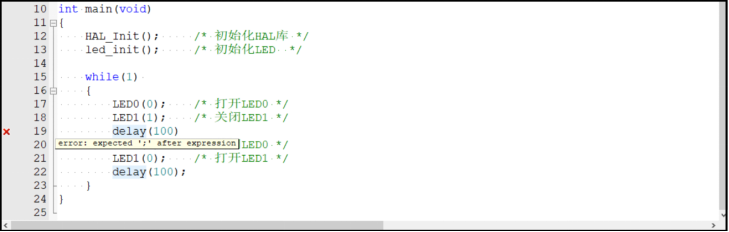 图4.3.2.3 语法动态检测功能 这几个功能,对我们编写代码很有帮助,可以加快代码编写速度,并且及时发现各种问题。不过这里要提醒大家,语法动态检测这个功能,有的时候会误报(比如sys.c里面,就有误报),大家可以不用理会,只要能编译通过(0错误,0警告),这样的语法误报,一般直接忽略即可。 4.3.3 代码编辑技巧 这里给大家介绍几个我常用的技巧,这些小技巧能给我们的代码编辑带来很大的方便,相信对你的代码编写一定会有所帮助。 1、TAB键的妙用 首先要介绍的就是TAB键的使用,这个键在很多编译器里面都是用来空位的,每按一下移空几个位。如果你是经常编写程序的对这个键一定再熟悉不过了。但是MDK的TAB键和一般编译器的TAB键有不同的地方,和C++的TAB键差不多。MDK的TAB键支持块操作。也就是可以让一片代码整体右移固定的几个位,也可以通过SHIFT+TAB键整体左移固定的几个位。 假设现在有一段代码如图4.3.3.1所示: