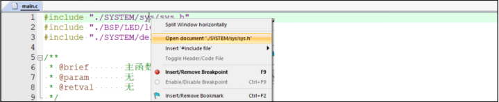 图4.3.3.7 注释完毕 这样就快速的注释掉了一片代码,而在某些时候,我们又希望这段注释的代码能快速的取消注释,MDK也提供了这个功能。与注释类似,先选中被注释掉的地方,然后通过右键Advanced,不过这里选择的是Uncomment Selection。 4.3.4 其他小技巧 除了前面介绍的几个比较常用的技巧,这里还介绍几个其他的小技巧,希望能让你的代码编写如虎添翼。 第一个是快速打开头文件。在将光标放到要打开的引用头文件上,然后右键选择Open Document“XXX”,就可以快速打开这个文件了(XXX是你要打开的头文件名字)。如图4.3.4.1所示: