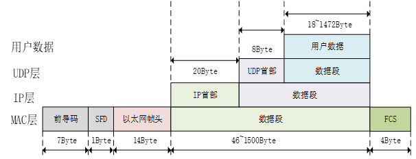 图 7.5.13.1 OSI参考模型 以太网UDP传输单包数据的格式由图 7.5.13.2所示。从图中可以看出,以太网的数据包就是对各层协议的逐层封装来实现数据的传输。用户数据打包在UDP协议中,UDP协议又是基于IP协议之上的,IP协议又是走MAC层发送的,即从包含关系来说:MAC帧中的数据段为IP数据报,IP报文中的数据段为UDP报文,UDP报文中的数据段为用户希望传输的数据内容。接下来我们逐个来向大家介绍不同层的数据格式。