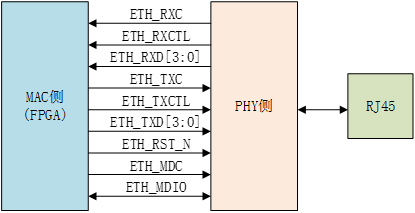 图 7.5.13.8 MAC侧与PHY侧接口连接 ETH_RXC:接收数据参考时钟,1000Mbps速率下,时钟频率为125MHz,时钟为上下沿同时采样;100Mbps速率下,时钟频率为25MHz;10Mbps速率下,时钟频率为2.5MHz,ETH_RXC由PHY侧提供。 ETH_RXCTL(ETH_RX_DV):接收数据控制信号。 ETH_RXD:四位并行的接收数据线。 ETH_TXC:发送参考时钟,1000Mbps速率下,时钟频率为125MHz,时钟为上下沿同时采样;100Mbps速率下,时钟频率为25MHz;10Mbps速率下,时钟频率为2.5MHz,ETH_TXC由MAC侧提供。 ETH_TXCTL(ETH_TXEN):发送数据控制信号。 ETH_TXD:四位并行的发送数据线。 ETH_RESET_N:芯片复位信号,低电平有效。 ETH_MDC:数据管理时钟(Management Data Clock),该引脚对ETH_MDIO信号提供了一个同步的时钟。 ETH_MDIO:数据输入/输出管理(Management Data Input/Output),该引脚提供了一个双向信号用于传递管理信息。 其中ETH_RXC、ETH_RXCTL和ETH_RXD为MAC接收侧引脚;ETH_TXC、ETH_TXCTL和ETH_TXD为MAC发送侧引脚;ETH_MDC和ETH_MDIO为MDIO接口引脚,用于配置PHY芯片内部寄存器;ETH_RST_N为PHY芯片硬件复位信号。由于PHY芯片的内部寄存器在默认配置下也可以正常工作,因此本次实验没有对MDIO接口进行读写操作,只用到了以太网的RGMII接口信号和复位信号。 RGMII使用4bit数据接口,在1000Mbps通信速率下,ETH_TXC和ETH_RXC的时钟频率为125Mhz,采用上下沿DDR(Double Data Rate)的方式在一个时钟周期内传输8位数据信号,即上升沿发送/接收低4位数据,下降沿发送/接收高4位数据。ETH_TXCTL和ETH_RXCTL控制信号同样采用DDR的方式在一个时钟周期内传输两位控制信号,即上升沿发送/接收数据使能(TX_EN/RX_ DV)信号,下降沿发送/接收使能信号与错误信号的异或值(TX_ERR xor TX_EN、RX_ERR xor RX_DV)。当RX_DV为高电平(表示数据有效),RX_ERR为低电平(表示数据无错误),则异或的结果值为高电平,因此只有当ETH_RXCTL和ETH_TXCTL信号的上下沿同时为高电平时,发送和接收的数据有效且正确。 当RGMII工作在100Mbps时,ETH_TXC和ETH_RXC的时钟频率为25Mhz,采用上升沿SDR的方式在一个周期内传输4位数据。不过此时ETH_TXCTL和ETH_RXCTL控制信号仍采用上下沿DDR的传输方式。 当RGMII工作在10Mbps时,ETH_TXC和ETH_RXC的时钟频率为2.5Mhz,采用上升沿SDR的方式在一个周期内传输4位数据。ETH_TXCTL和ETH_RXCTL控制信号也采用SDR的传输方式。 RGMII接口时序 PHY芯片的RGMII接口时序,其时钟、控制信号和数据的对齐方式,一般由MDIO接口或者硬件上的特殊引脚进行配置。 RGMII接收端口时钟、控制信号和数据对齐的时序图如下:
