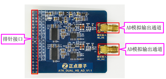 图 7.5.13.2 3PA1030原理图 上下两个电路是一样的,我们以上面的电路为例。上图中输入的模拟信号IN1(V1)经过衰减电路后得到AD_IN1(VO)信号,两个模拟电压信号之间的关系是VO=VI/5+1,即当VI=5V时,VO=2V;VI=-5V时,VO=0V。 ATK_DUAL_HS_AD模块的实物图如下图所示。