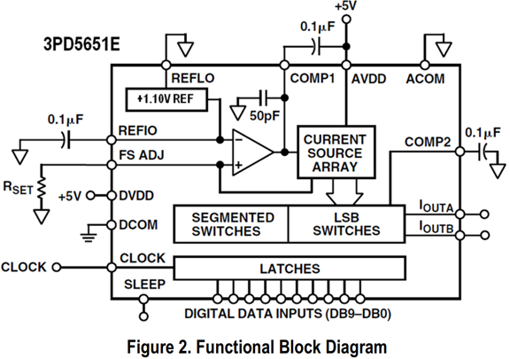 图 7.5.13.2 内部功能框图 3PD5651E在时钟(CLOCK)的驱动下工作,内部集成了+1.1V参考电压(+1.10V REF)、运算放大器、电流源(CURRENT SOURCE ARRAY)和锁存器(LATCHES)。两个电流输出端IOUTA和IOUTB为一对差分电流,当输入数据为0(DB9DB0=10’h000)时,IOUTA的输出电流为0,而IOUTB的输出电流达到最大,最大值的大小跟参考电压有关;当输入数据全为高点平(DB9DB0=10’h3ff)时,IOUTA的输出电流达到最大,最大值的大小跟参考电压有关,而IOUTB的输出电流为0。 3PD5651E必须在时钟的驱动下才能把数据写入片内的锁存器中,其触发方式为上升沿触发,3PD5651E的时序图如下图所示: