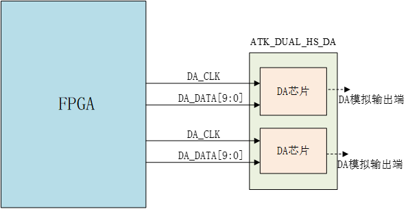 DAC(Digital to Analog Converter,即数模转换器)是大多数系统中必不可少的组成部件,用于将离散的数字信号转换成连续的模拟信号,它们是连接模电电路和数字电路必不可少的桥梁。在很多场合下, DAC的转换速度甚至直接决定了整个系统的运行速度。本章我们将使用高速DA芯片实现数模转换,产生正弦波模拟电压信号。 本章包括以下几个部分: 1.1 简介 1.2 实验任务 1.3 硬件设计 1.4 软件设计 1.5 下载验证 1.1 简介 本章我们使用的双路DA模块是正点原子推出的一款双路高速数模转换模块(ATK_DUAL_HS_DA),高速DA转换芯片是由思瑞浦公司生产的3PD5651E芯片。 ATK_HS_AD_DA模块的硬件结构图如下图所示。