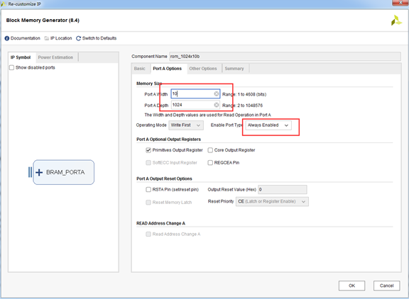 图 7.5.13.6 Block Memory Generator IP核的PortA Options配置页面 我们将PortA的位宽设置为10,深度设置为1024,以存储上位机生成的1024个数据。此外,将使能引脚的类型设置为“Always Enabled”,即ROM一直处于使能的状态。 接下来配置“Other Options”选项页,加载刚才生成的.coe文件,如下图所示: