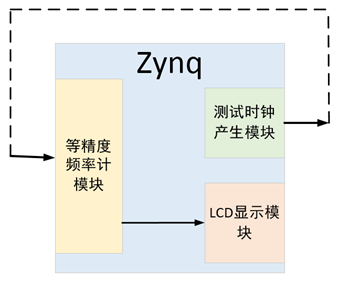 图 7.5.13.2 Zynq实现的功能的原理图 实验任务 板载50MHz的时钟通过内部逻辑进行分频,来产生500KHz频率的信号,作为被测时钟,然后用Verilog HDL编写的等精度测量模块测量被测时钟,并通过LCD显示。 硬件设计 本次实验只需将领航者开发板J3扩展口的两个IO使用跳帽或者杜邦线连接即可。本次实验将Zynq的K14引脚做为分频产生的时钟的输出端,J14引脚作为被测时钟的输入端,通过一根导线(杜邦线)或者跳帽进行连接。