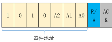 图 7.5.13.3 I2C具体时序图 如果要想回答这些问题,我们得读懂图 7.5.13.3。由图 7.5.13.3可知,我们在起始信号之后,主机开始发送传输的数据;在串行时钟线SCL为低电平状态时,SDA允许改变传输的数据位(1为高电平,0为低电平),在SCL为高电平状态时,SDA要求保持稳定,相当于一个时钟周期传输1bit数据,经过8个时钟周期后,传输了8bit数据,即一个字节。第8个时钟周期末,主机释放SDA以使从机应答,在第9个时钟周期,从机将SDA拉低以应答;如果第9个时钟周期,SCL为高电平时,SDA未被检测到为低电平,视为非应答,表明此次数据传输失败。第9个时钟周期末,从机释放SDA以使主机继续传输数据,如果主机发送停止信号,此次传输结束。我们要注意的是数据以8bit即一个字节为单位串行发出,其最先发送的是字节的最高位。 I2C的时序部分已经基本介绍完了,但还有一个小问题,就是当多个I2C器件挂接在总线上时,怎样才能与我们想要传输数据的器件进行通信。这就涉及到了器件地址(也称从机地址,SLAVE ADDRESS)。 每个I2C器件都有一个器件地址,有些I2C器件的器件地址是固定的,而有些I2C器件的器件地址由一个固定部分和一个可编程的部分构成,这是因为很可能在一个系统中有几个同样的器件,器件地址的可编程部分能最大数量的使这些器件连接到I2C总线上,例如EEPROM器件,为了增加系统的EEPROM容量,可能需要多个EEPROM。器件可编程地址位的数量由它可使用的管脚决定,比如EEPROM器件一般会留下3个管脚用于可编程地址位。但有些I2C器件在出厂时器件地址就设置好了,用户不可以更改(如实时时钟PCF8563的器件地址为固定的7’h51)。所以当主机想给某个器件发送数据时,只需向总线上发送接收器件的器件地址即可。 对于AT24C64而言,其器件地址为1010加3位的可编程地址,3位可编程地址由器件上的3个管脚A2、A1、A0(见图 7.5.13.2)的硬件连接决定。当硬件电路上分别将这三个管脚连接到GND或VCC时,就可以设置不同的可编程地址。对于我们的开发板,这3个管脚连接到地。 进行数据传输时,主机首先向总线上发出开始信号,对应开始位S,然后按照从高到低的位序发送器件地址,一般为7bit,第8bit位为读写控制位R/W,该位为0时表示主机对从机进行写操作,当该位为1时表示主机对从机进行读操作,然后接收从机响应。对于AT24C64来说,其传输器件地址格式如下图所示。
