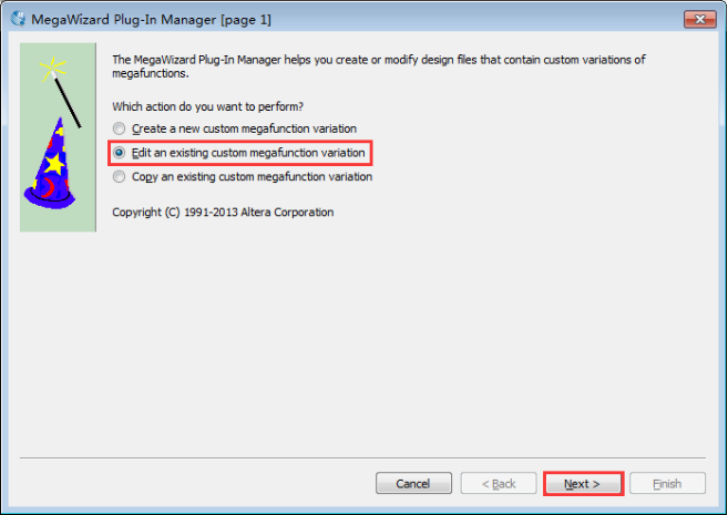 图 19.4.16 修改IP核页面 和我们第一次创建IP核不同的是,这一次我们选择第二个选项,修改已经存在的IP核,然后点击【Next>】,进入选择IP核路径页面,双击ipcore文件夹,进入下图所示页面。然后双击ram_2port.v文件或者选中ram_2port.v文件,点击【Next>】开始重新配置RAM IP核。