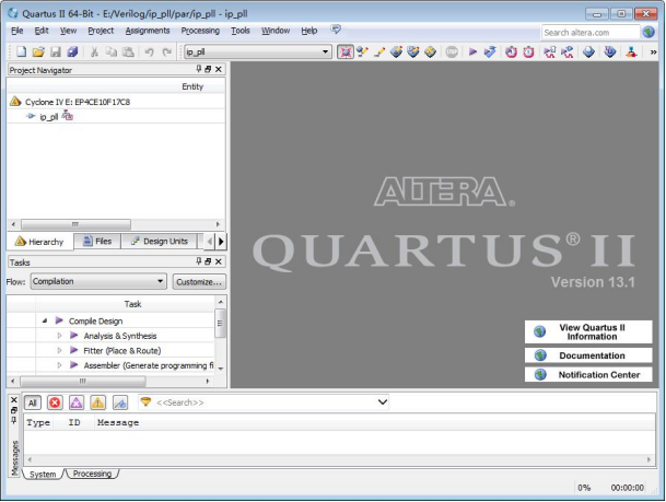 图 17.4.23 开始编译工程界面 工程编译成功后,打开Pin Planner配置FPGA的管脚,管脚约束按照本章“13.3节 硬件设计”中表 17.3.1的列表来分配,分配完成后重新编译工程。 接下来我们对PLL IP核进行仿真,来验证锁相环输出的时钟频率是否正确。首先在Modelsim软件中创建一个名为tb_ip_pll的工程,在这里我们就不再给出软件创建工程的详细过程,如果大家对Modelsim软件的创建过程还不熟悉的话,可以参考前面章节 Modelsim软件的安装与使用部分。 tb_ip_pll仿真文件源代码如下: