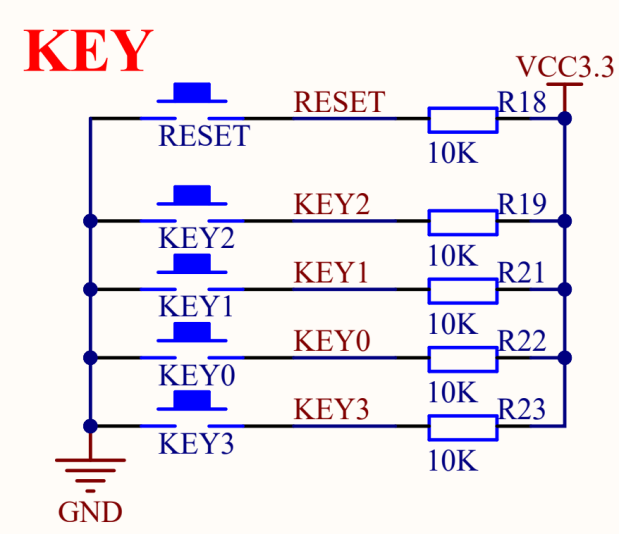 图 3.1.5 时钟/复位/按键接口 其中5个输入按键(1个复位按键,4个功能按键)的电路原理图如下图所示: