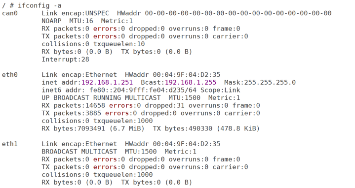 图66.3.2.2 使能Freescale的FlexCAN驱动 配置好以后重新编译内核,然后使用新的内核和设备树启动开发板。 66.4 FlexCAN测试 66.4.1 检查CAN网卡设备是否存在 使用新编译的内核和设备树启动开发板,然后输入如下命令: ifconfig -a //查看所有网卡 前面我们说了,Linux系统中把CAN总线接口设备作为网络设备进行统一管理,因此如果FlexCAN驱动工作正常的话就会看到CAN对应的网卡接口,如图66.4.1.1所示: