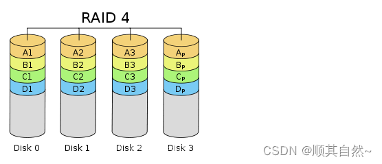 RAID4 在不同磁盘上的同级数据块同样使用 XOR 校验,结果存储在校验盘中。写入数据时, RAID4 按这种方式把各磁盘上的同级数据的校验值写入校验 盘,读取时进行即时校验。因此,当某块磁盘的数据块损坏, RAID4 可以通过校验值以及其他磁盘上的同级数据块进行数据重建。