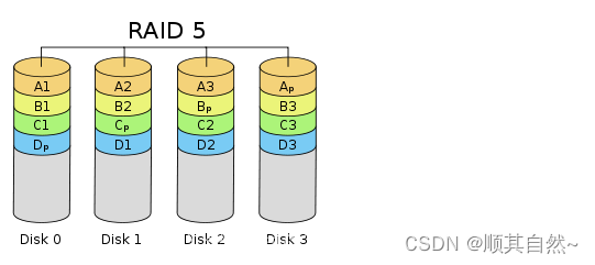 RAID5 兼顾存储性能、数据安全和存储成本等各方面因素,它可以理解为 RAID0 和 RAID1 的折中方案,是目前综合性能最佳的数据保护解决方案。 RAID5 基本上可以满足大部分的存储应用需求,数据中心大多采用它作为应用数据的保护方案。