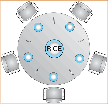 一张圆桌上坐着5位哲学家,每位哲学家之间的桌子上摆一根筷子,桌子的中间是一碗米饭。