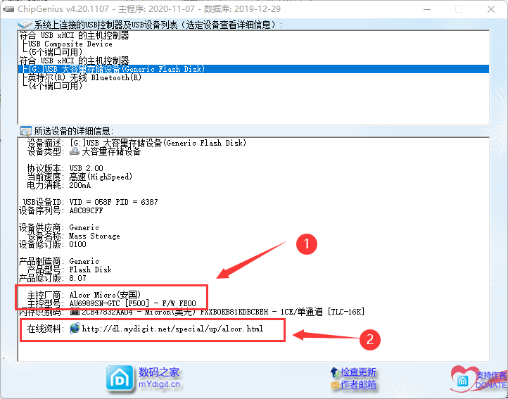 二、查找对应的量产工具打开Chipgenius_v4_20_1107.exe这个应用程序,插入被写保护的U盘,它会自动读取U盘信息。根据你的主控厂商“Alcor Micro(安国)”和主控号“AU6989SN-GTC”,按照最下面的在线资料提供的网址查找对应的量产工具。 ①主控厂商和对应的主控型号 ②对应的在线资料下载链接