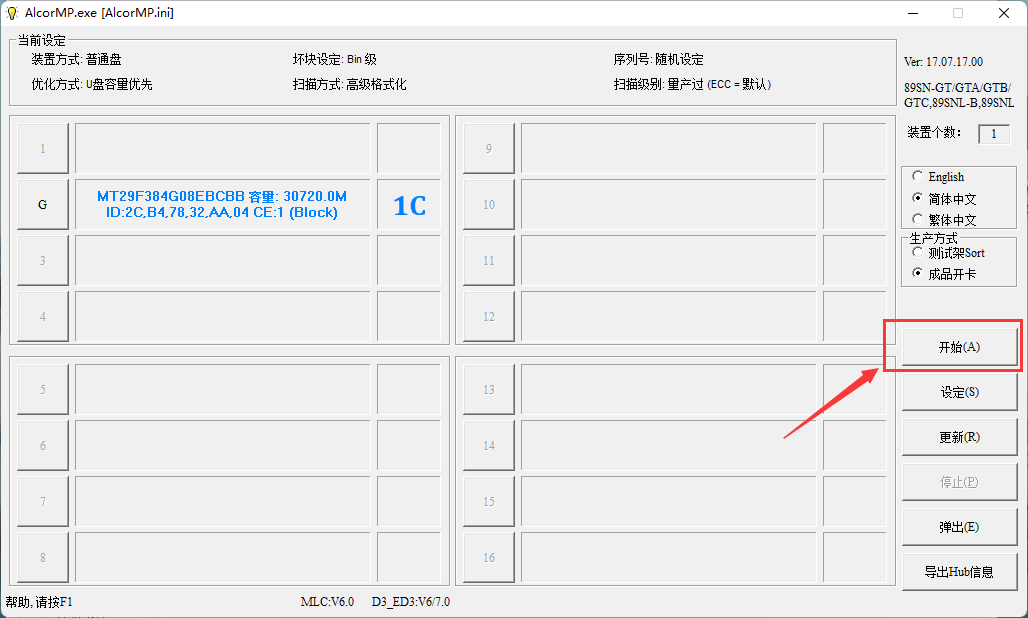 打开的大致界面如下:(不同的主控厂商和对应的主控型号对应的软件界面不一样,但是功能大同小异) 打开它会提示是否量产U盘,这里直接点击即可,30s之后,U盘就量产完成,里面的文件也全部被格式化了,整个过程不超过5min。
