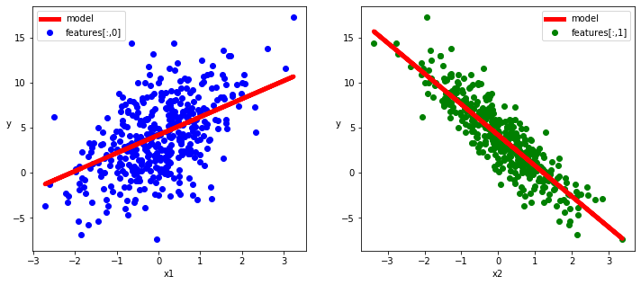 ax2.plot(features[:,1],w[0,1]*features[:,1]+b[0],"-r",linewidth = 5.0,label = "model")