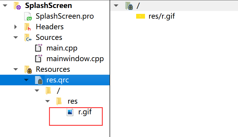 在编写main.cpp之前,首先需要添加资源文件,资源文件添加十分简单,这里不进行详细介绍,我的代码中将图片r.gif添加到Qt资源文件res中,如下所示。