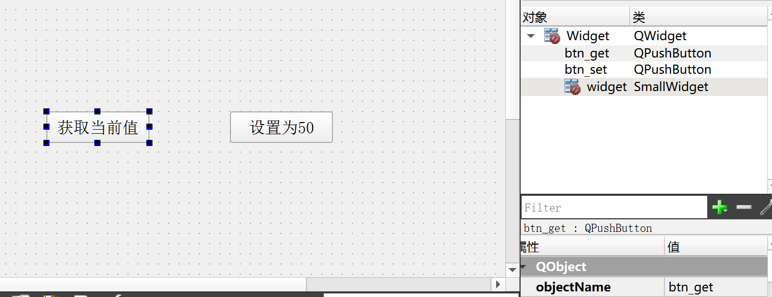 在widget.ui中放入两个按钮,将其ObjectName分别命名为:btn_get和btn_set。