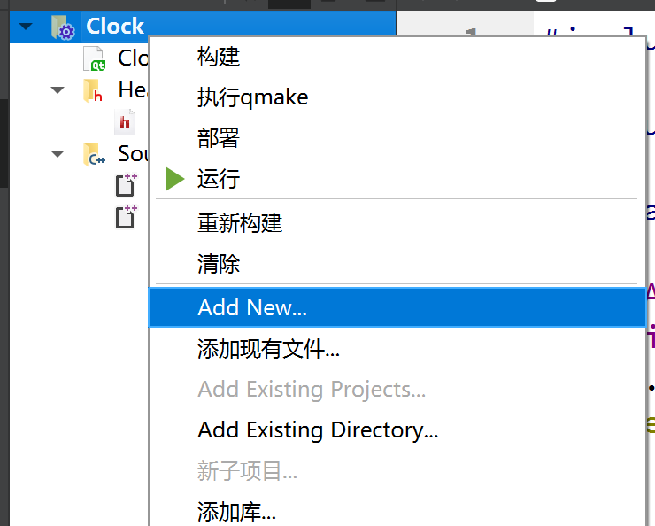 四、主程序实现 4.1 添加新文件添加新文件: 选择“C++ Class”选项,单击“Choose”按钮,选择“Base class”文本框中输入基类名“QLCDNumber”(手动添加),在“Class name”文本框中输入类的名称“DigiClock”: